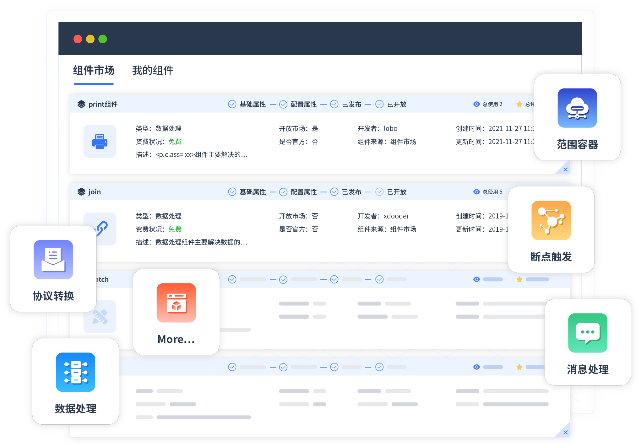 针对集成场景,,,钱能钱包提供组件市场,,例如协议转换、、、消息处理、、、、文件操作等。。。除平台提供的组件外,,,客户可以自定义所需组件。。。。