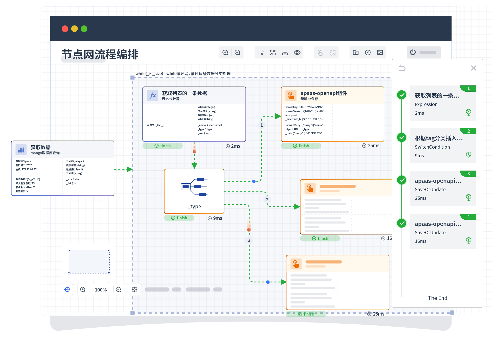 针对集成场景,,,,组件定义后支持进行流程编制,,,不同于传统代码方式,,,通过图形化展示,,支持在线调试、、、日志查看和运行回放。。。