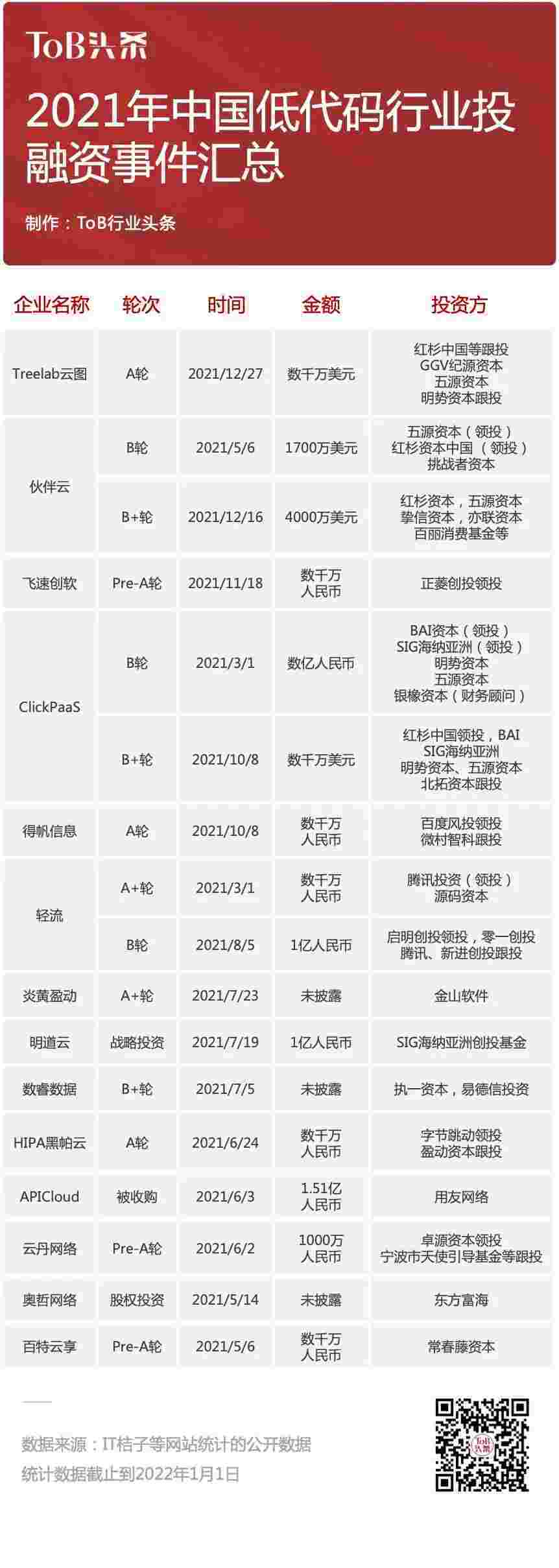 到2021年,,,无/低代码投融资规模势头更甚,,,,其中包括轻流两轮融资(A+轮数千万人民币,,,,B轮近亿人民币)、、钱能钱包 两轮融资(B轮数亿人民币,,,,B+轮数千万美元)、、、百特云享数千万元Pre-A轮融资......